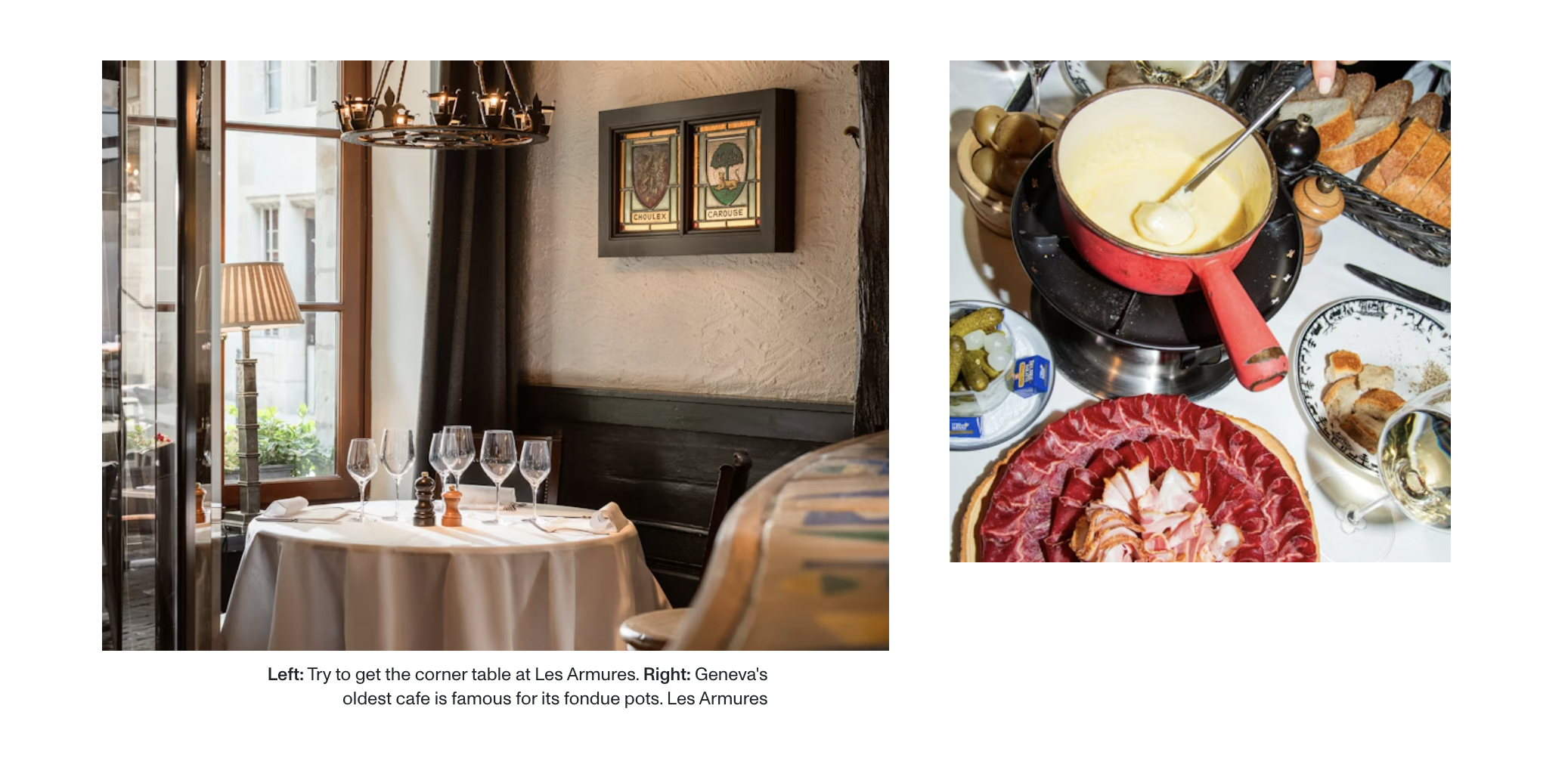 How to get it: There’s usually a wait for a table, reservation or not, but it’s worth it. Also, walk here. Geneva is a small, walkable city, and part of the charm of Les Armures is working up a pre-dinner appetite traversing its beautiful bridges.